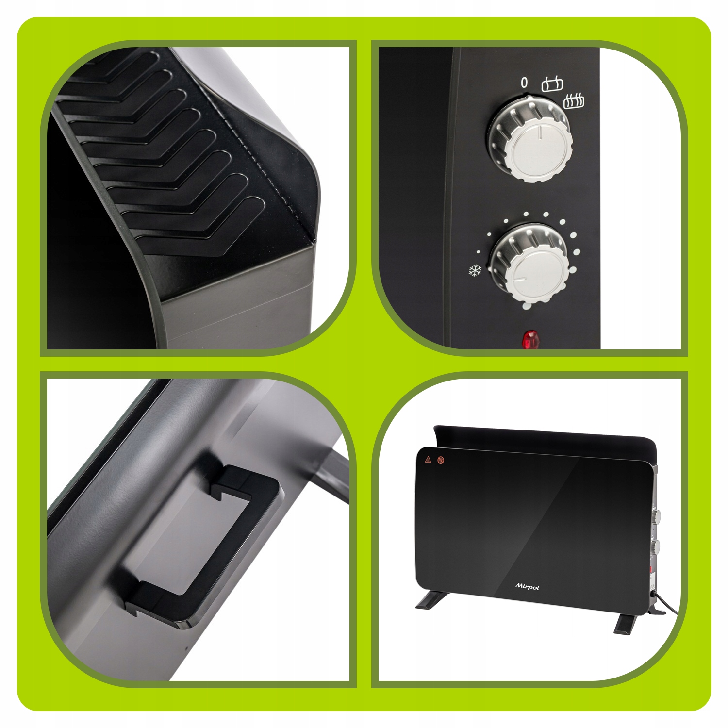 - Конвекторний обігрівач виготовлений з міцного загартованого скла , що забезпечує довговічність пристрою та додає йому естетичного вигляду.